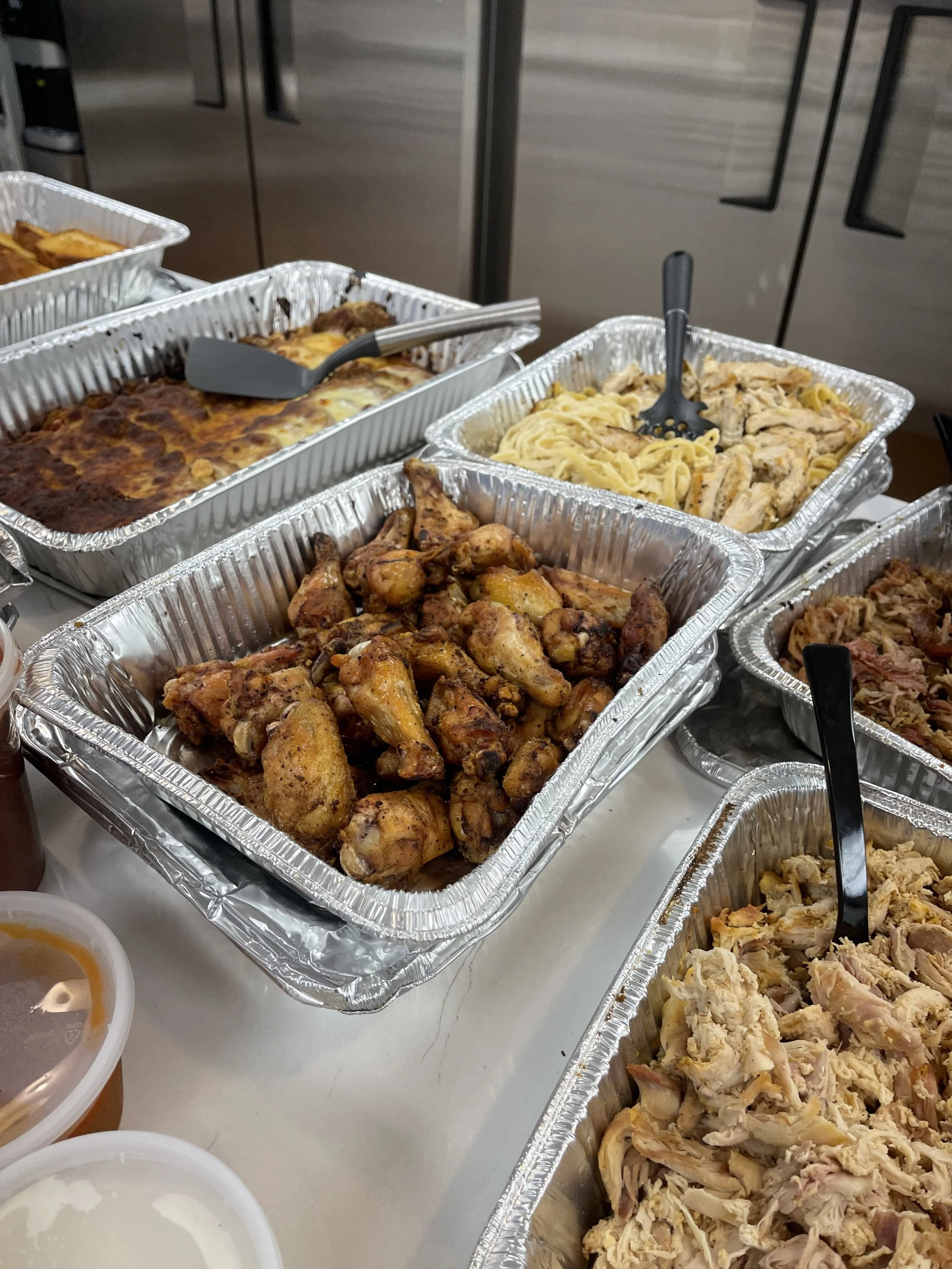 Pasta Bar – A variety of pasta options served with rich marinara, creamy Alfredo, or pesto sauce, along with proteins and fresh parmesan. $12/person