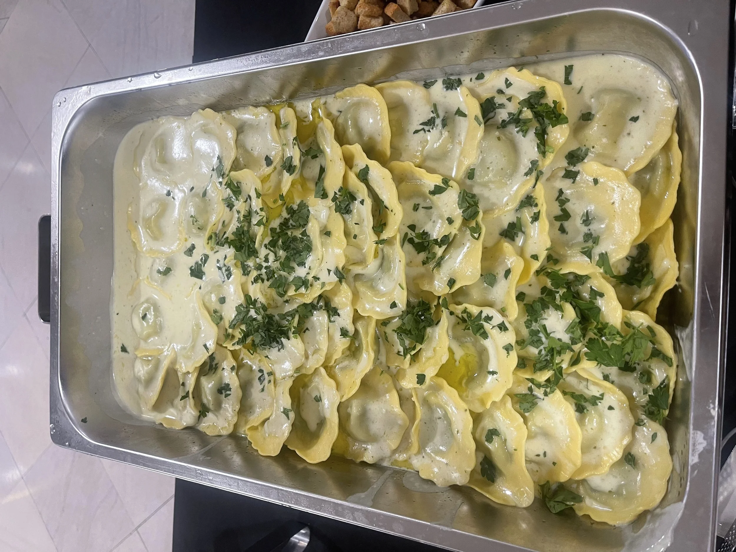 Cheese‑filled ravioli blended with fresh spinach, tossed in a velvety Alfredo sauce infused with fragrant basil pesto for a smooth, herb‑forward flavor.