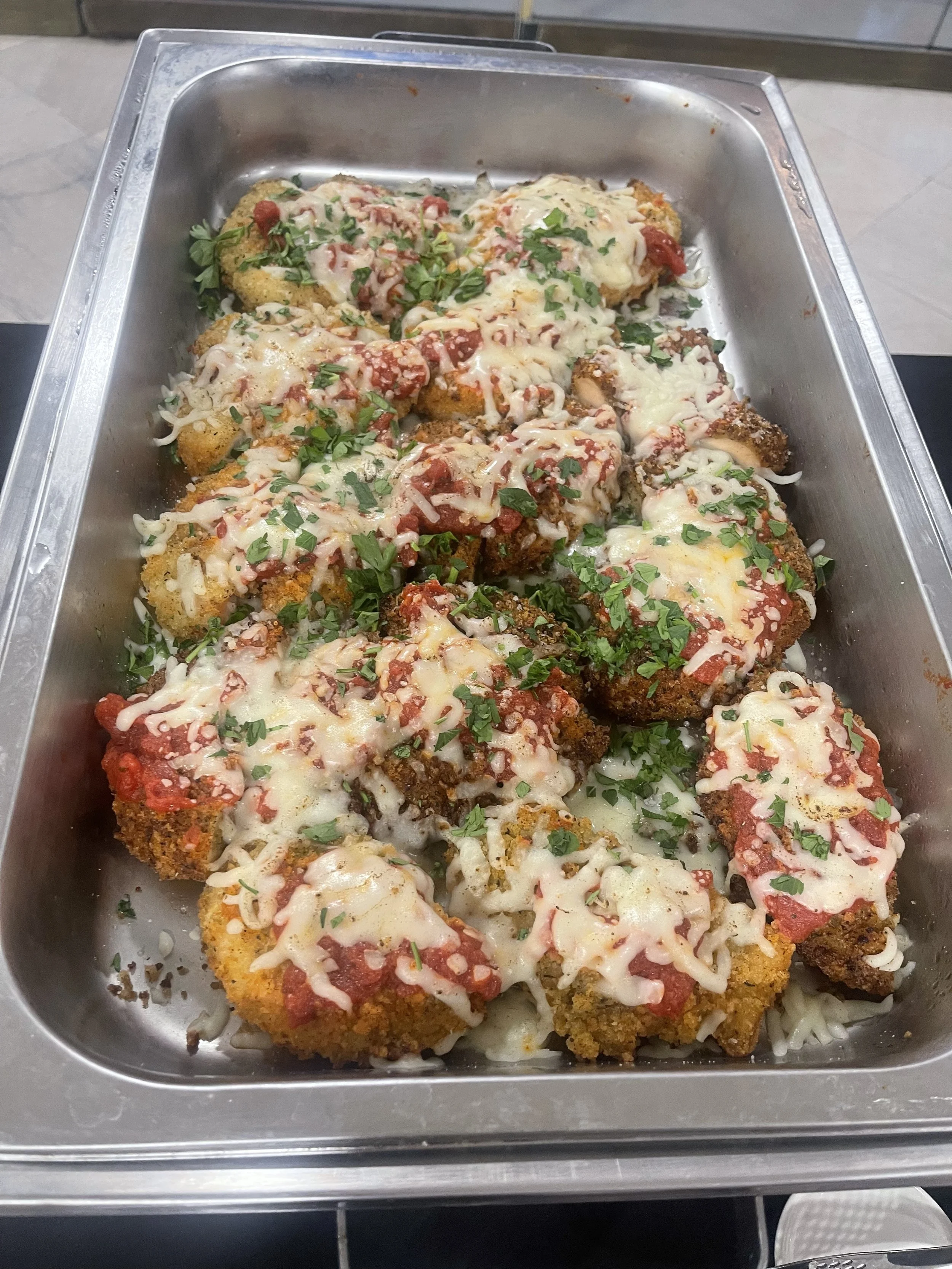 Breaded eggplant slices baked with marinara sauce and melted mozzarella, creating a hearty and satisfying vegetarian entrée.